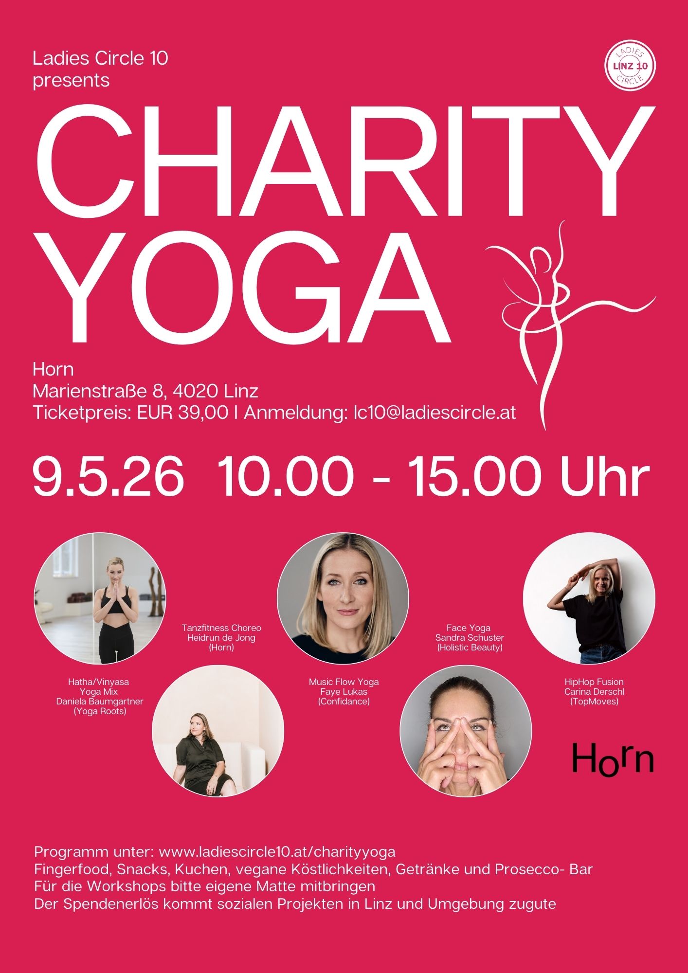 Von 10:00 bis 15:00 Uhr werden verschiedene Workshops angeboten. Jede Einheit dauert 40 Minuten – so kannst du den ganzen Tag über mehrere Sessions mitmachen und das volle Programm nutzen. Bitte die eigene Matte nicht vergessen!